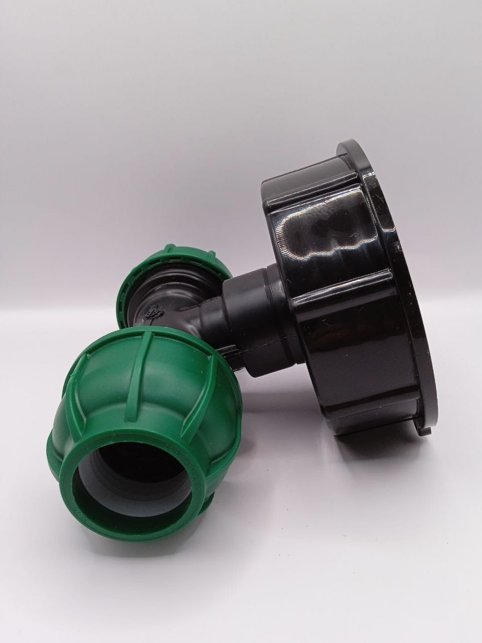 Перехідник DN-100 (S100×8) призначений для під’єднання двох труб або шлангів Ø25 мм до єврокубів IBC 1000 л із великим виходом DN-100.