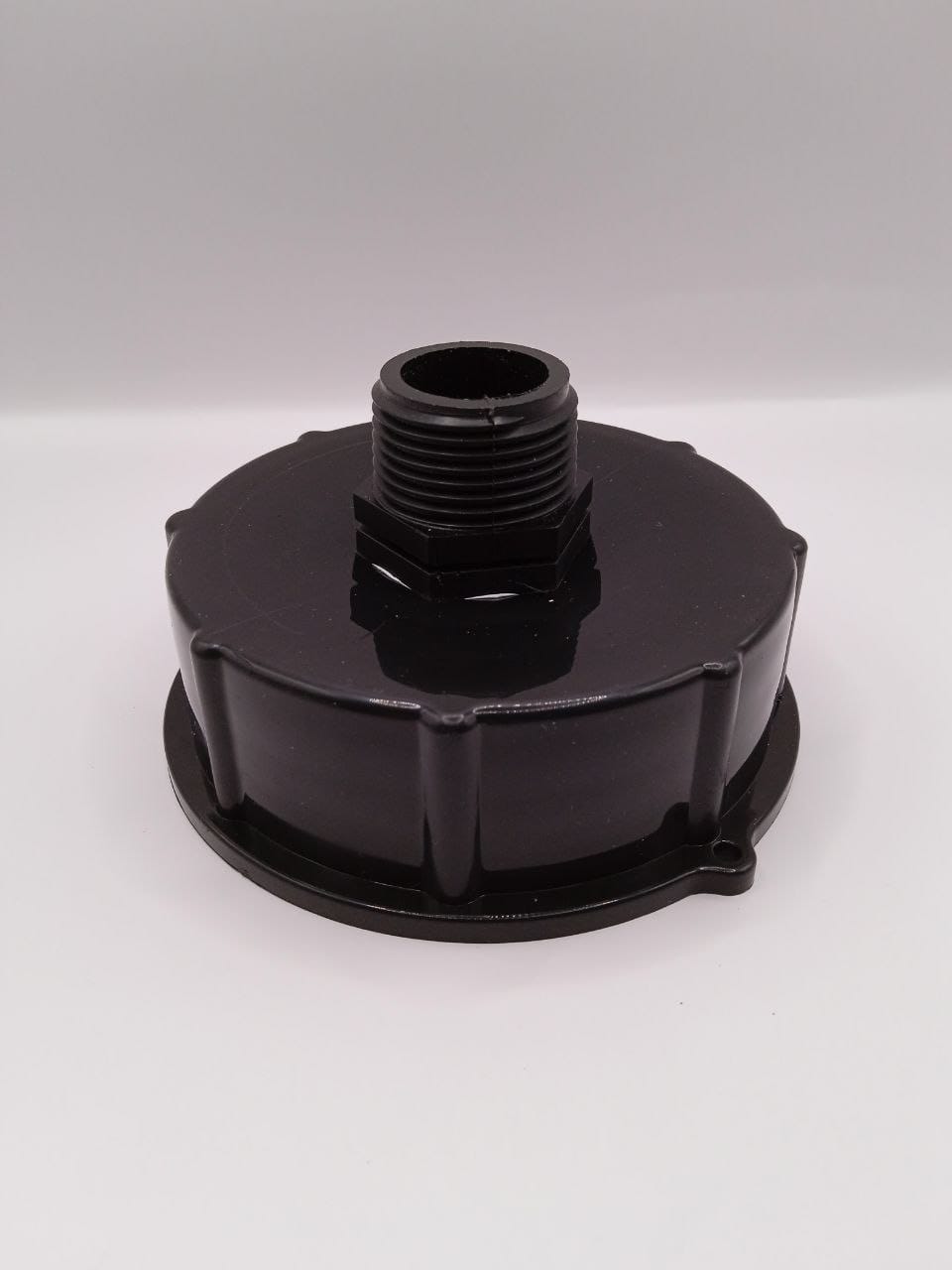Литий пластиковий перехідник для IBC/Єврокубів: зі сторони куба DN-100 (велика різьба S100×8), на виході — зовнішня різьба 1″. Дозволяє під’єднати стандартну арматуру 1″ (крани, муфти, швидкороз’єми).