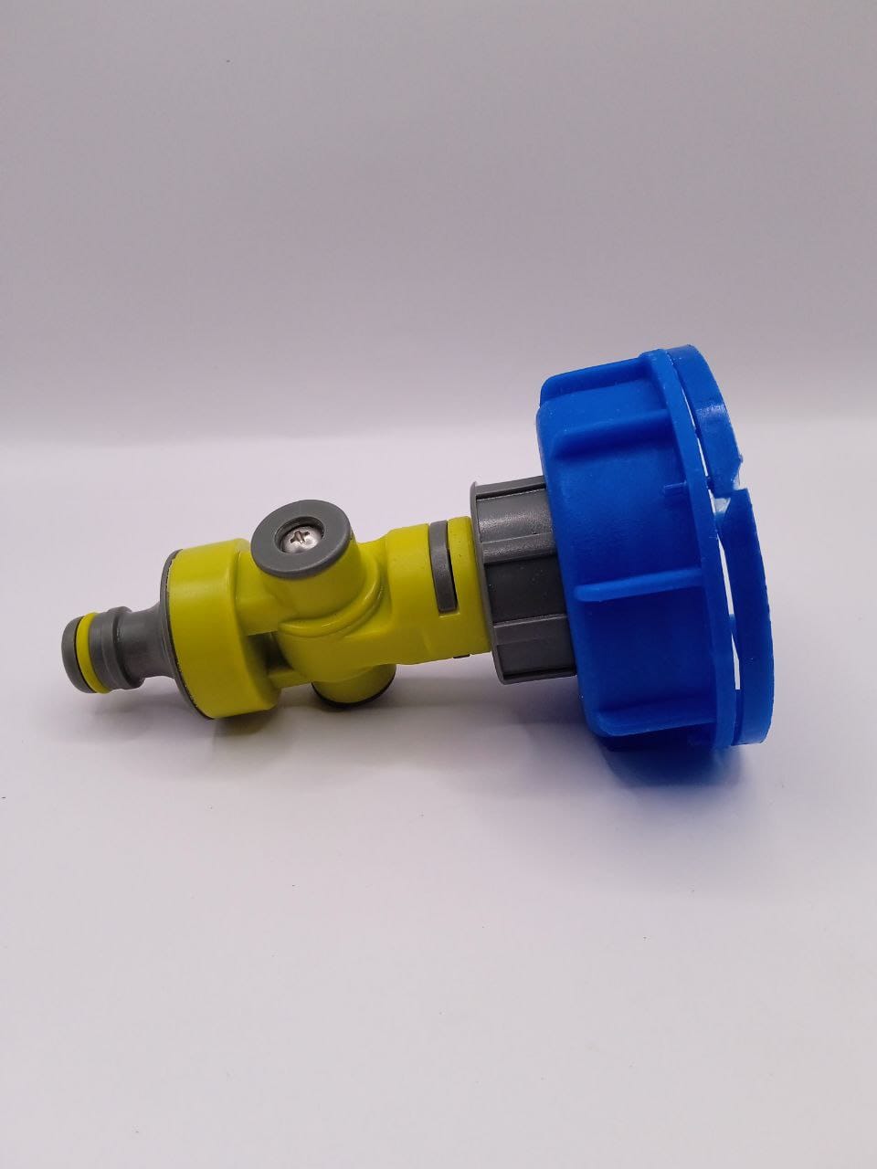 Литий пластиковий перехідник для IBC/Єврокубів: зі сторони куба DN-50 (2″, S60×6), на виході — штуцер 1″ (~25 мм). Оснащений поворотною гайкою (swivel) для вільного орієнтування без перекручування шланга.