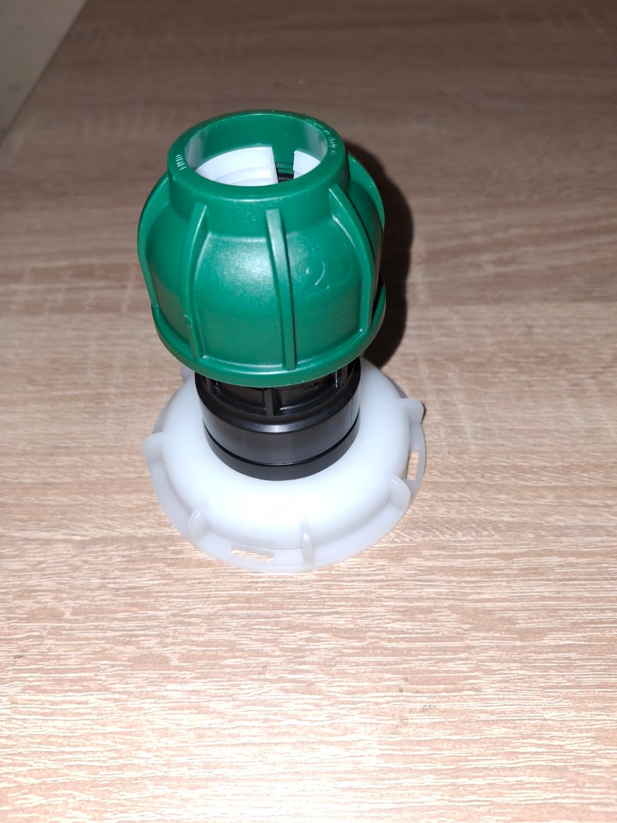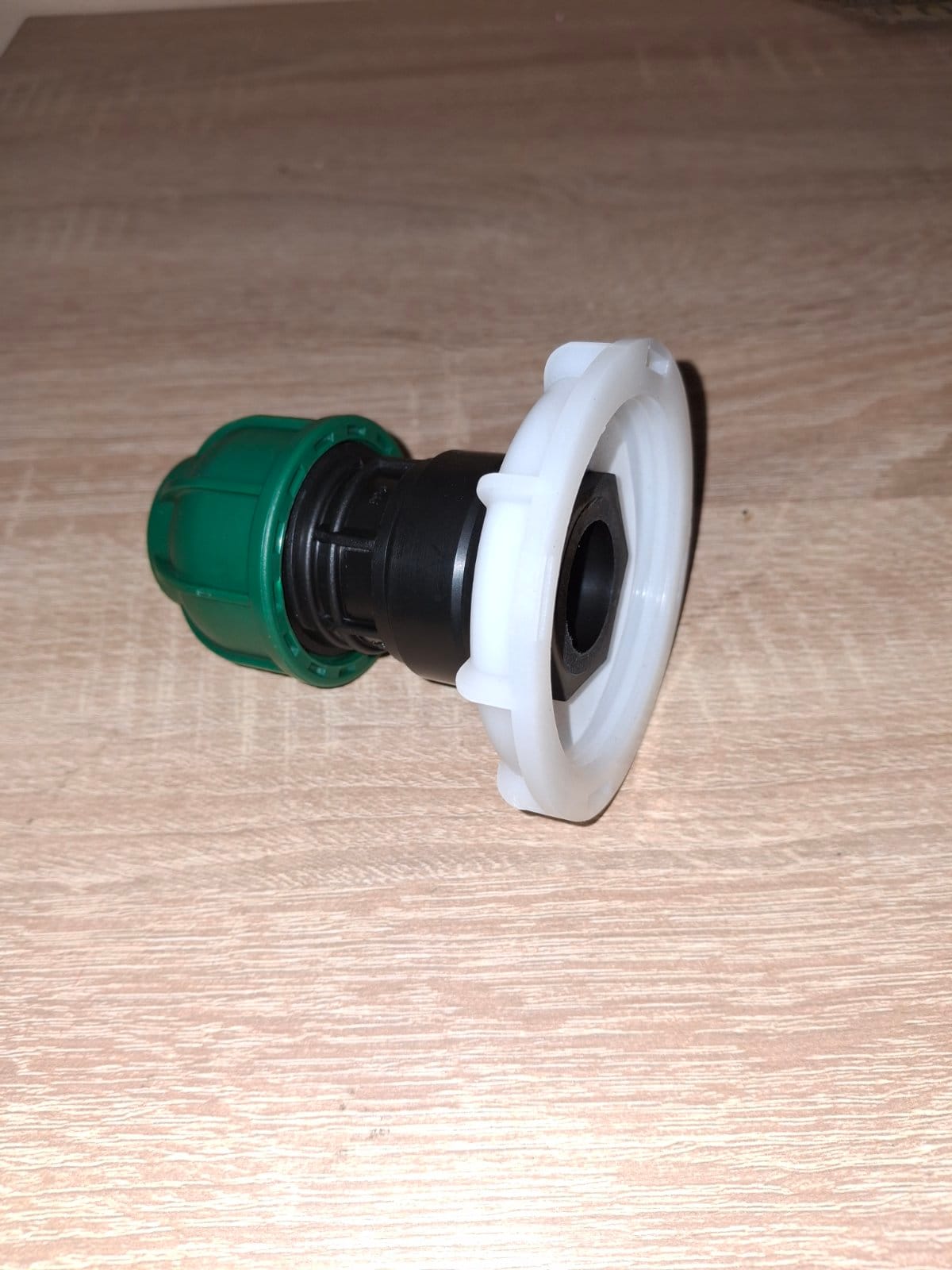 Литий пластиковий перехідник для клапанів IBC/Єврокубів із дрібною різьбою Ø62 мм (не S60×6) на вихід під трубу Ø25 мм (~1″). Забезпечує швидке та герметичне підключення у системах зливу, подачі та дозування рідин.